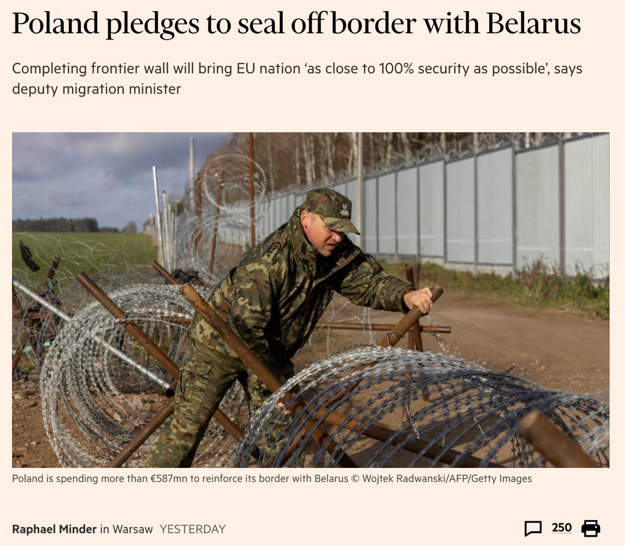 Як сказано у замітці, до наступного літа Польща має намір завершити будівництво прикордонної стіни та закрити кордон із Білоруссю, щоб зупинити приплив мігрантів, який Варшава називає гібридною війною Росії.