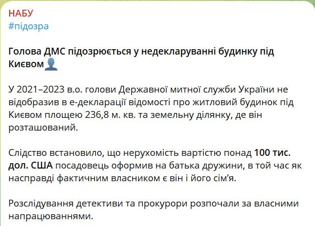 Керівника Державної митної служби підозрюють у недекларуванні будинку на 100 тисяч доларів.