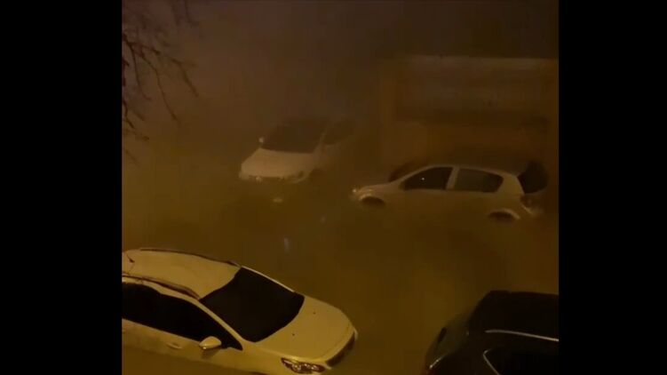Вода молочного кольору, що парує, затопила припарковані поруч автомобілі. Надворі, що проходить у низині, вода піднялася до середини дверей машин.