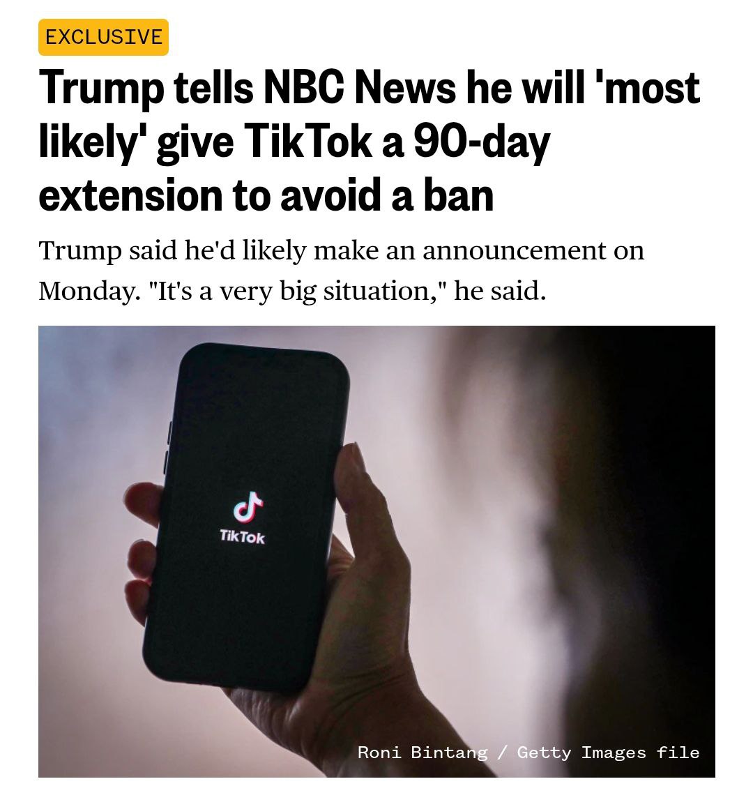 Тим часом Дональд Трамп у коментарі NBC News вже заявив, що після своєї інавгурації "швидше за все" надасть соцмережі ТікТок 90-денну відстрочку від заборони у США.