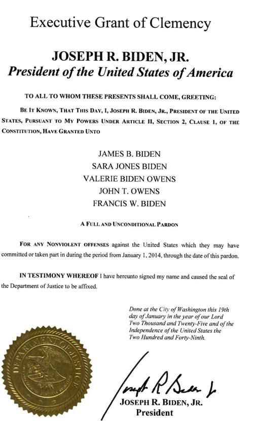 "Саме тому я використовую свої повноваження, надані Конституцією, щоб помилувати Джеймса Байдена, Сару Джонс Байден, Валері Байден Оуенс, Джона Оуенса та Френсіса Байдена", - повідомляється у прес-релізі.