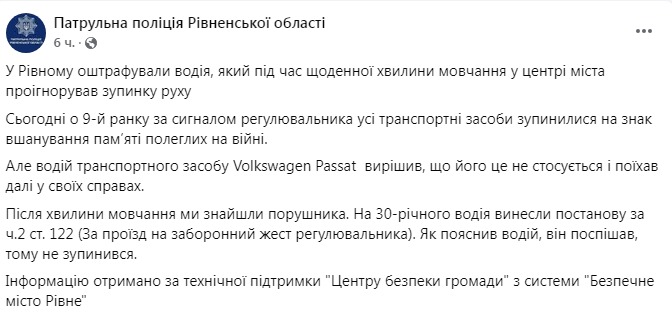 "Сьогодні о 9-й ранку за сигналом регулювальника всі транспортні засоби зупинилися на знак пам'яті загиблих на війні. Але водій транспортного засобу Volkswagen Passat вирішив, що його це не стосується, і поїхав далі у своїх справах. Після хвилини мовчання ми виявили порушника. На 30- літнього водія винесли постанову за ч.2 ст. 122 (за проїзд на заборонений жест регулятора). водій він поспішав, тому і не зупинився", - зазначили в поліції.