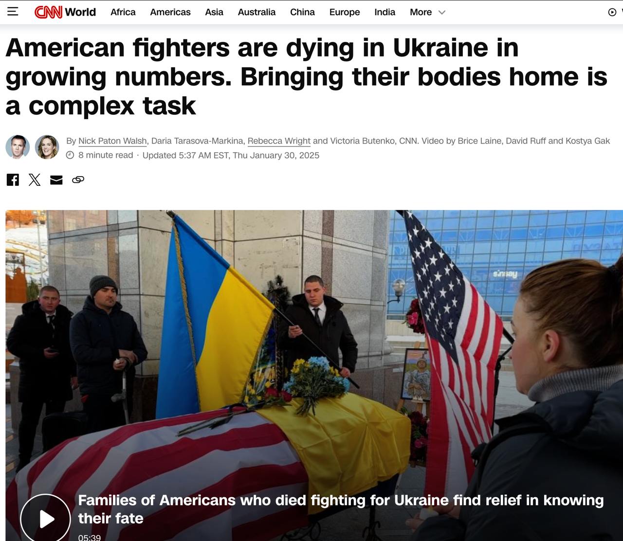 За даними телеканалу, лише понад 20 американських добровольців зникли безвісти на передовій в Україні. За останні шість місяців тіла щонайменше п'ятьох не вдалося забрати з поля бою. У п'ятницю двоє репатріювали Росія в Україну.