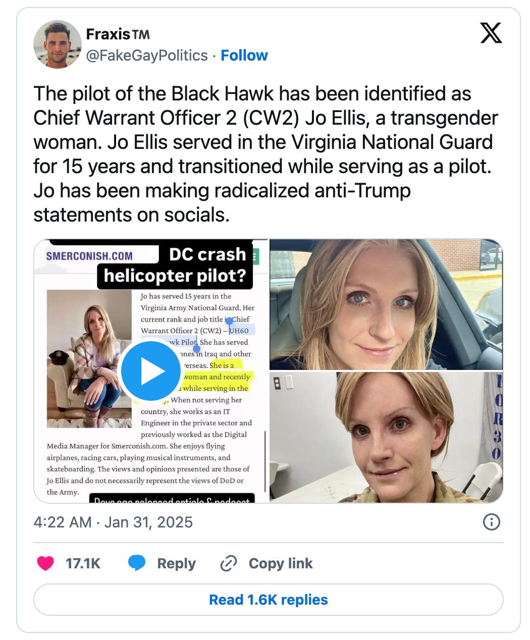 "За чутками, трансгендерна жінка Джо Елліс була пілотом вертольота Black Hawk, який зіткнувся в повітрі з літаком American Airlines. Хоча її особистість привернула значну увагу у соціальних мережах, інформація залишається офіційно непідтвердженою владою", - пише Santa Monica Observer.