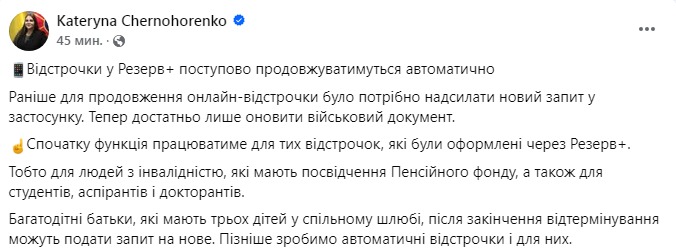 Спочатку функція працюватиме для відстрочок, які були оформлені через "Резерв+", для людей з інвалідністю, які мають посвідчення Пенсійного фонду, а також для студентів, аспірантів та докторантів.