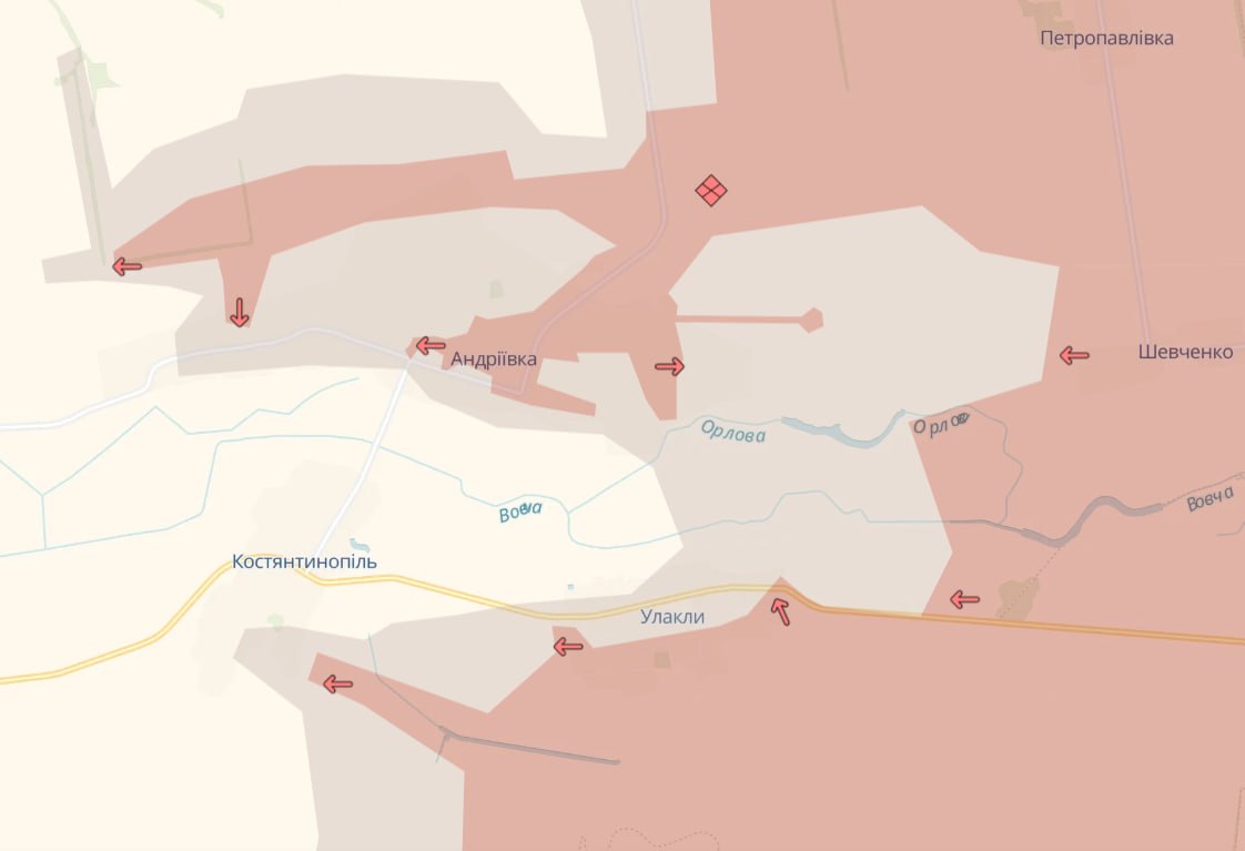 Раніше ми підбивали підсумки попереднього дня. Армія РФ вкотре суттєво просунулась в "Андріївському мішку" і підійшла вже до Константинополя, свідчить карта Deep State. На захід від Великої Новосілки росіяни захопили половину села Новосілка. Українські сили вибили армію РФ із траси з Покровська на Костянтинівку. Також росіяни суттєво просунулися в районі Кліщеївки та Андріївки.