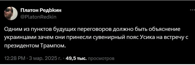 "Директор ЦРУ Джон Реткліфф щойно повідомив Марії Бартіромо (журналіст Fox News - Ред. ), що США призупинили постачання зброї та розвідданих в Україну в результаті зустрічі в Овальному кабінеті. Реткліфф каже, що з нетерпінням чекає зняття паузи і роботи з Україною в напрямку миру".