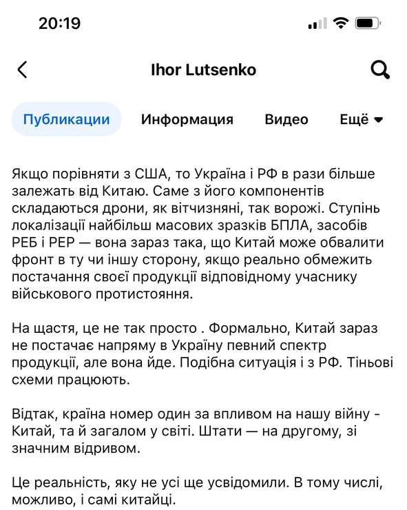 Він робить висновок, що "країна номер один за впливом на нашу війну – Китай, і взагалі у світі".
