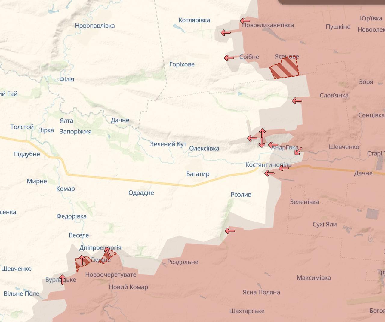15.42 На Донеччині росіяни просунулися з боку Великої Новосілки до траси на Запоріжжі через село Скудне. А також на північ від району Ясенево, повідомляє Deep State.