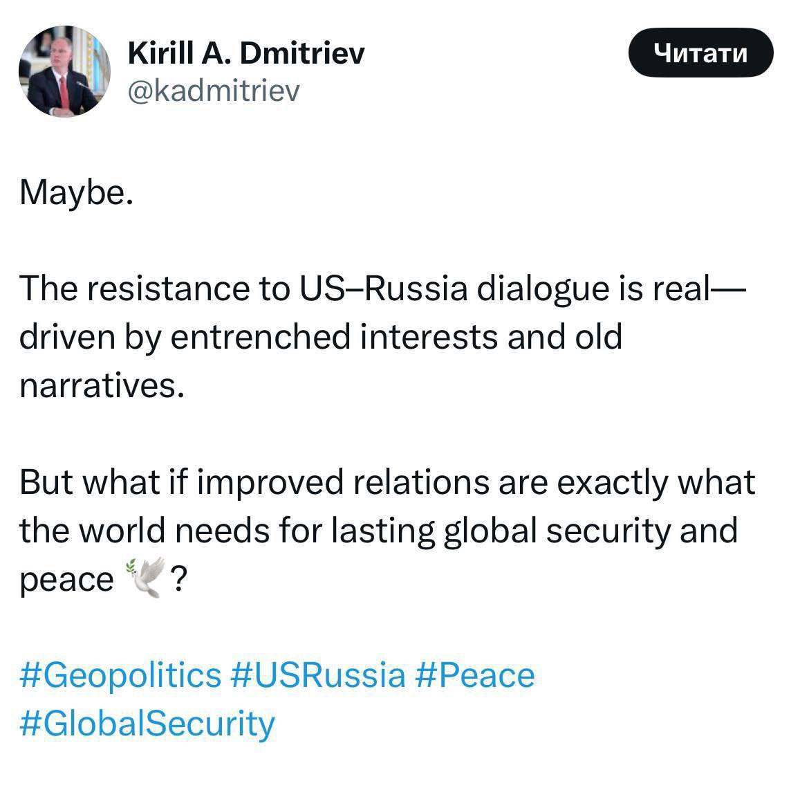 "Опір діалогу між США та Росією існує через укорінені інтереси і старі наративи. Але що, якщо поліпшення відносин - це саме те, що потрібно миру для довгострокової глобальної безпеки і миру?" – написав він.