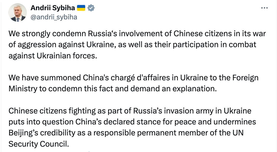 Тим часом МЗС України вже викликало повіреного у Києві у справах Китаю після полону двох громадян КНР і має намір вимагати пояснень. Про це повідомив Сібіга у Х.