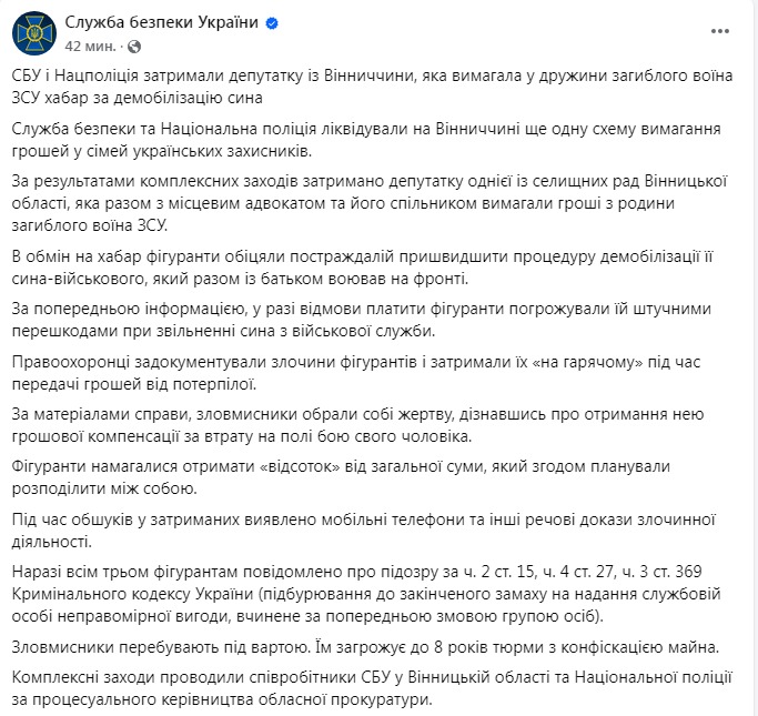 Правоохоронці затримали депутата однієї із селищних рад Вінницької області, яка разом із місцевим адвокатом та його спільником вимагала у вдови загиблого військового гроші за демобілізацію сина. В обмін на хабар вони обіцяли жінці прискорити процедуру демобілізації. А у разі відмови платити погрожували завадити звільненню сина з військової служби.