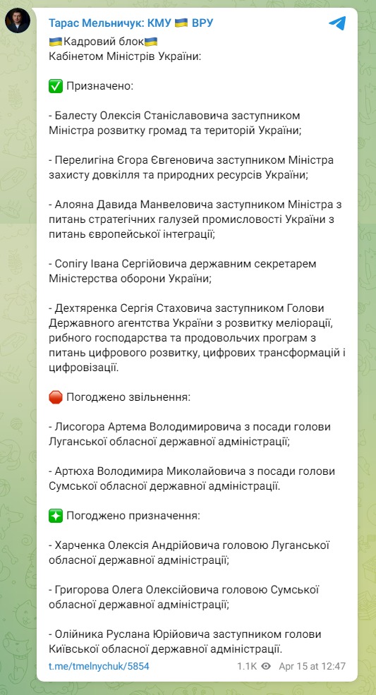 Про звільнення повідомив у своєму телеграм-каналі представник уряду у Верховній Раді Тарас Мельничук.