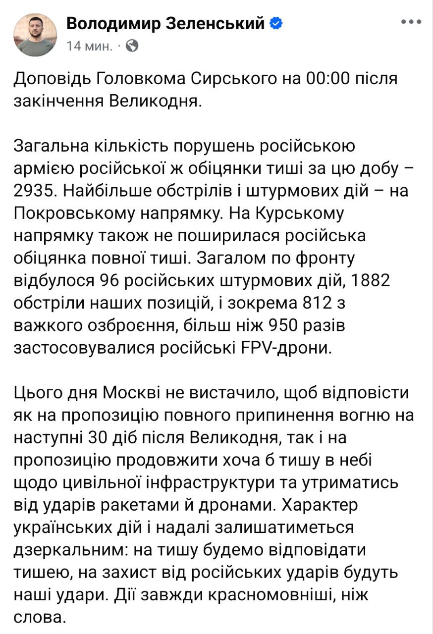 Це сталося після закінчення терміну великоднього перемир'я. До цього Росія повітряних атак не проводила (що раніше визнав і Зеленський). Тобто фактично перемир'я скінчилося.