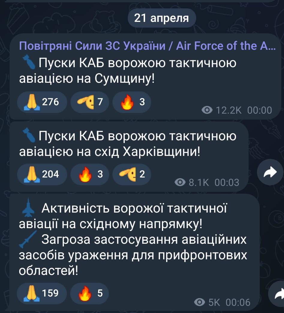 Тим часом РФ відновила повітряні удари по Україні. Повітряні сили ЗСУ повідомили про пуски КАБ Харківською та Сумською областями.