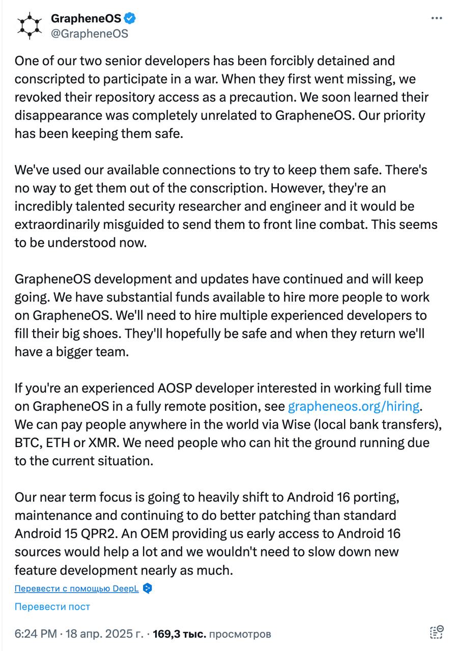 18 квітня офіційні акаунти GrapheneOS написали, що кілька тижнів тому одного з двох провідних розробників проекту "було насильно затримано та відправлено на війну". За словами колег, відразу після зникнення "як запобіжний захід" відкликали його доступ до проекту.