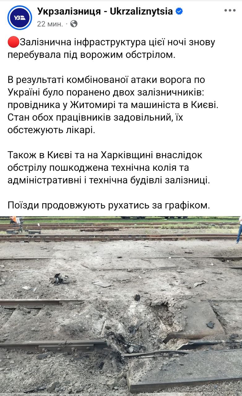 07:52 Під час повітряного удару по Україні було атаковано об'єкти залізниці.