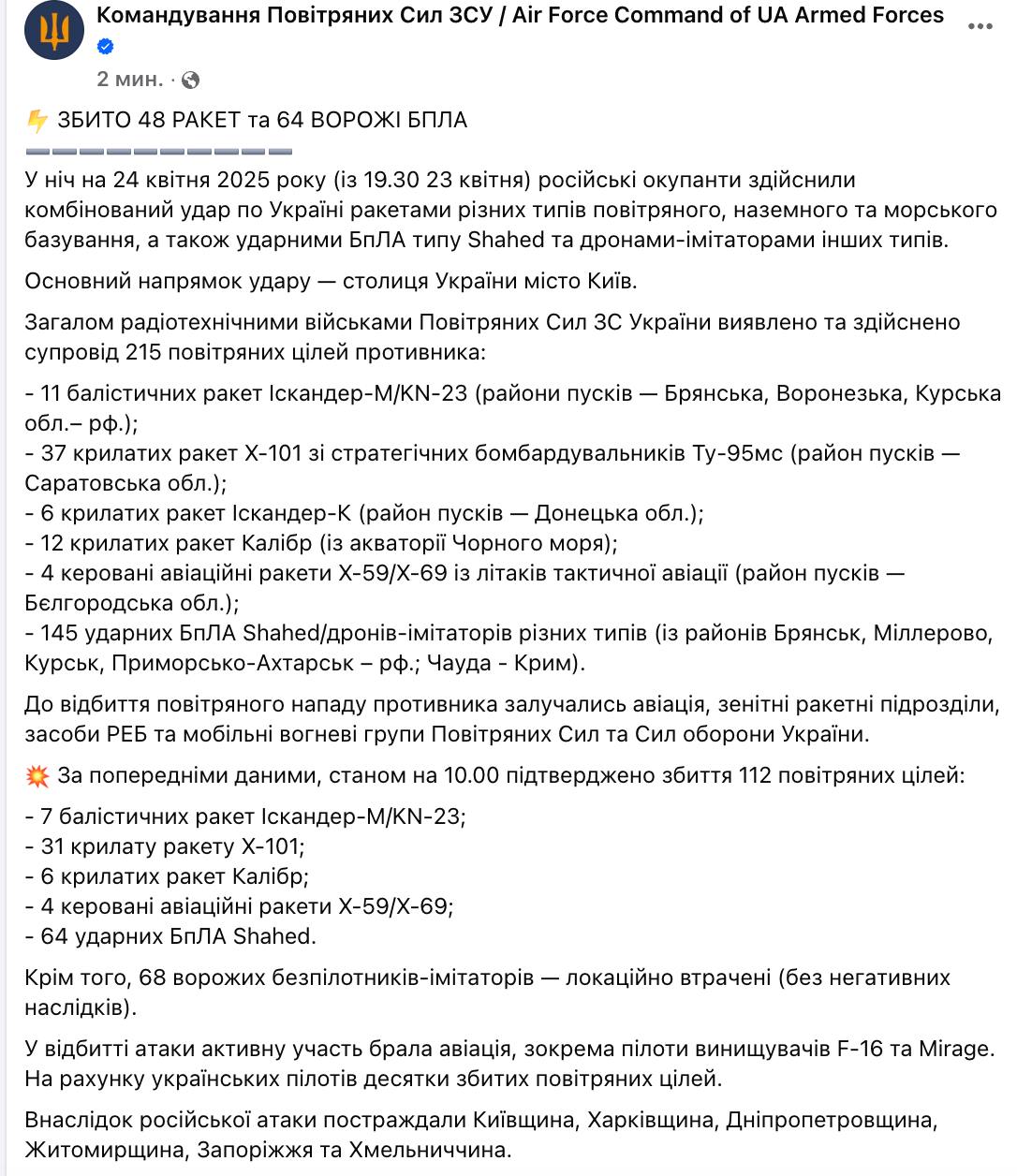 10:04 Повітряні сили повідомляють, що цієї ночі збили 48 ракет із 70 та 64 "Шахедів" із 145 (ще 68 "локаційно втрачено без негативних наслідків")