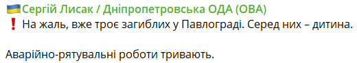 Троє людей загинули внаслідок удару РФ по Павлограду, серед них – дитина. Шістьох постраждалих госпіталізовано. Одна пацієнтка тяжка, інші – у стані середньої тяжкості.