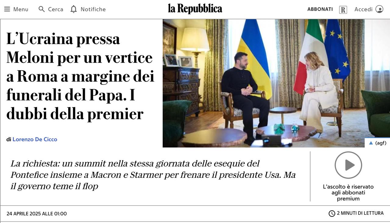 Україна пропонує провести саміт у Римі, куди з'їдуться світові лідери на похорон папи римського - Le Repubblica