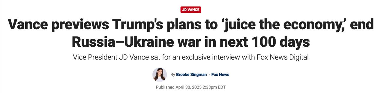 "Перші 100 днів — це ви майже виправляєте і вирішуєте всі ті речі, які дуже легко зробити. У наступні 100 днів багато чого не зміниться так швидко. Очевидно, у нас є багато питань зовнішньої політики, над якими ми працювали, і як мені здається, вони так чи інакше дадуть результат протягом наступних 100 днів... Президент хотів би щотижня гинути 5 000 людей з обох боків", - заявив Венс.