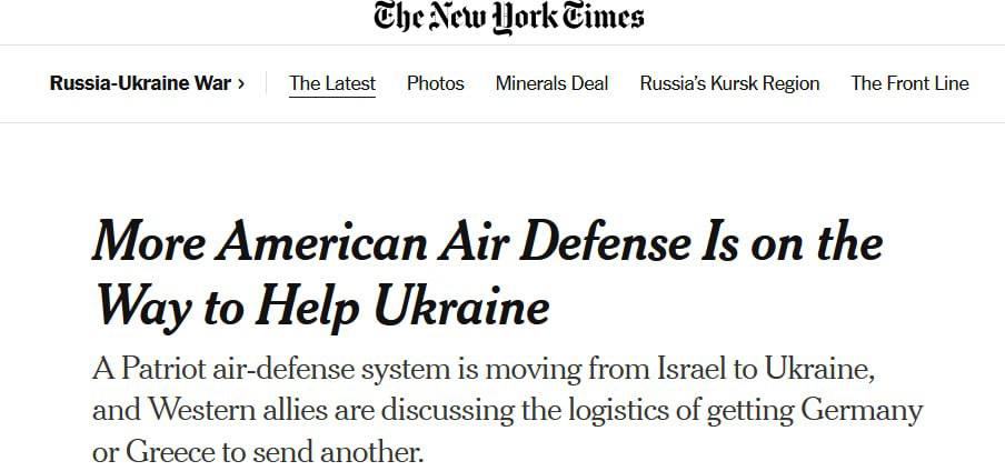 "Система ППО Patriot, що базувалася в Ізраїлі, буде передана Україні після ремонту, також західні союзники обговорюють організацію передачі ще однієї з боку Німеччини чи Греції", - йдеться у статті.