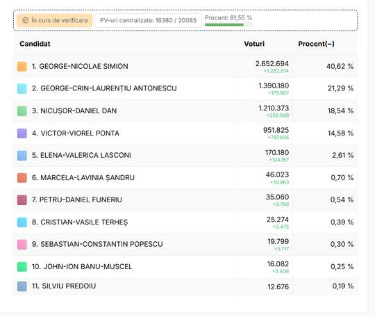 Таким чином голова партії "Альянс за об'єднання румунів" очолює президентські перегони та перемагає у першому турі виборів. На другому місці – провладний кандидат Крін Антонеску з 21,29% голосів.
