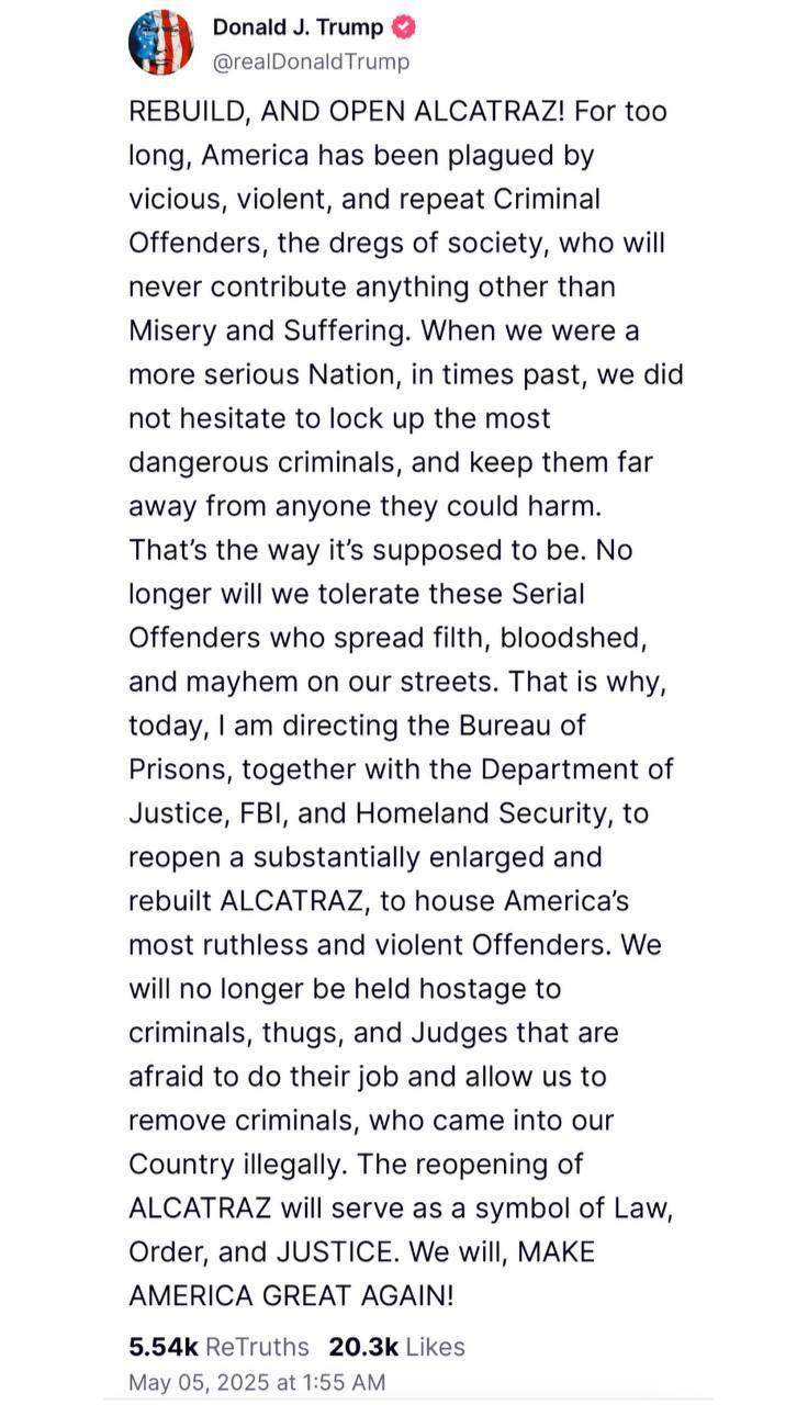 "Відновлення і відкриття Алькатраса! Занадто довго Америку терзали порочні, жорстокі люди і рецидивісти, покидьки суспільства, які ніколи не принесуть нічого, крім нещастя і страждань. Коли ми були більш серйозною країною, у минулі часи, ми не вагаючись саджали найнебезпечніших злочинців і могли тримати. Ми більше не терпітимемо цих серійних злочинців, які розповсюджують бруд, кровопролиття і хаос на наших вулицях. головорізів та суддів, які бояться виконувати свою роботу і дозволяють нам висилати злочинців, які незаконно прибули до нашої країни.
