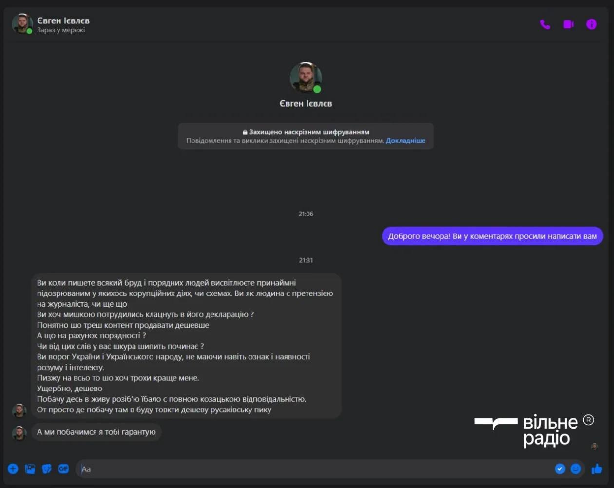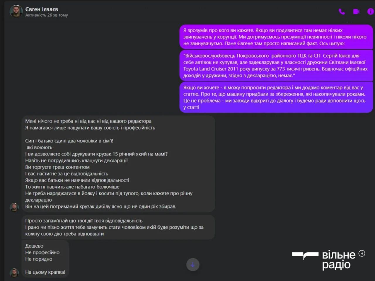 А пізніше журналіст Євген Вакуленко опублікував листування із сином фігуранта матеріалу, речником Київської міської військової адміністрації Євгеном Євлєвим. Той звинувачує журналіста у непрофесійності, каже, що він не вивчив повною мірою декларацію, а насамкінець загрожує насильством.