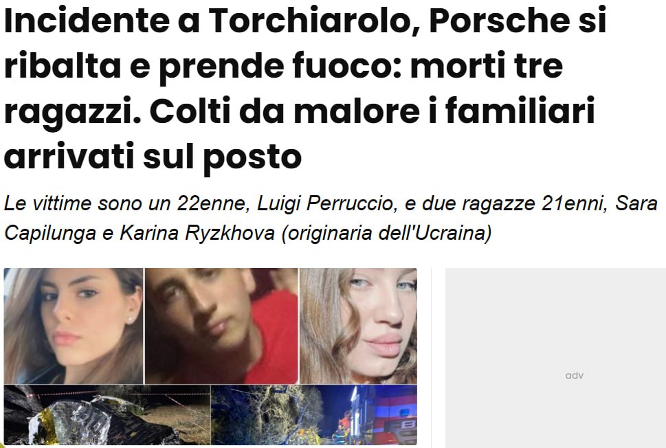В Італії Porsche з біженкою з України, її нареченим та подругою на величезній швидкості врізався у дерево. Фото