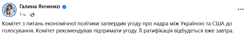 "Комітет з питань економічної політики затвердив угоду про надра між Україною та США до голосування. Комітет рекомендував підтримати угоду", - написала Янченко.