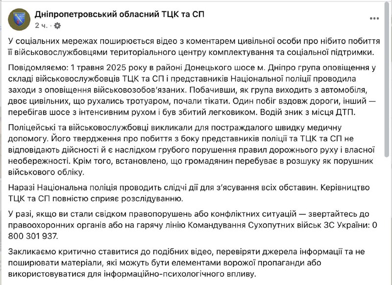 "У соціальних мережах поширюється відео з коментарем цивільної особи про нібито побиття його військовослужбовцями територіального центру комплектування та соціальної підтримки. Повідомляємо: 1 травня 2025 року в районі Донецького шосе Дніпра група оповіщення у складі військовослужбовців ТЦК та СП та представників Національної полі. як група виходить з автомобіля, двоє рухалися по тротуару цивільних почали бігти. відповідають дійсності та є наслідком грубого порушення правил дорожнього руху та необережності. Крім того, встановлено, що громадянин перебуває у розшуку як порушник військового обліку. Керівництво ТЦК та СП повністю сприяє розслідуванню", - сказано у публікації.