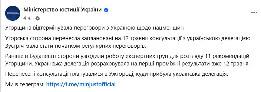 Угорщина перенесла заплановані на 12 травня переговори з українською делегацією з прав національних меншин.