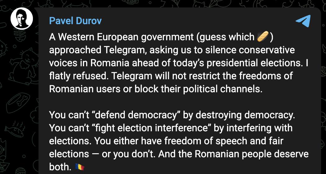 "Західноєвропейський уряд (вгадайте, який?🥖) звернувся до Telegram з проханням змусити замовкнути консервативні голоси в Румунії перед сьогоднішніми президентськими виборами. Я категорично відмовився. Telegram не обмежуватиме свободи румунських користувачів або блокуватиме їх політичні канали.