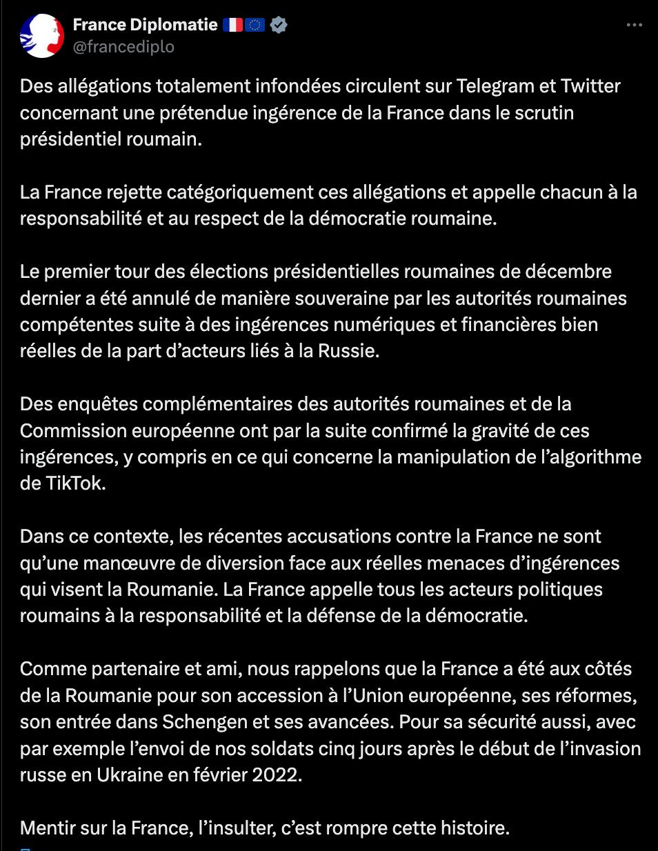 "Звинувачення на адресу Франції є лише відволікаючим маневром перед реальними загрозами втручання у справи Румунії. Франція закликає всіх політичних діячів Румунії виявити відповідальність і захистити демократію", - заявив МЗС Франції.