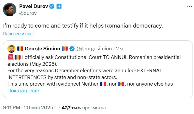 "Я готовий приїхати та дати свідчення, якщо це допоможе румунській демократії", - написав Дуров.