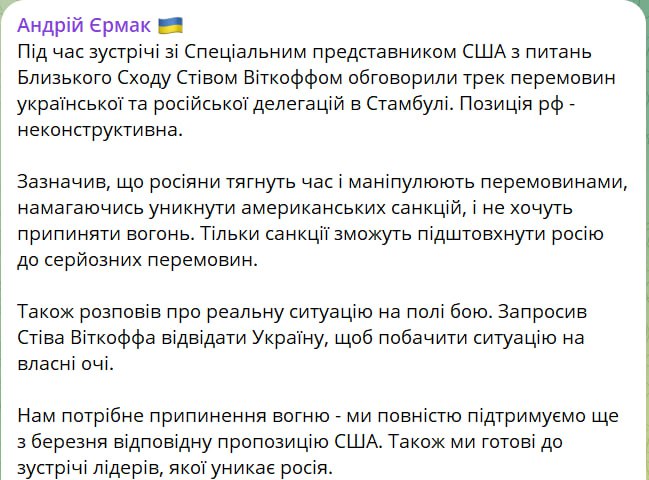 Глава Офісу президента Андрій Єрмак у Вашингтоні зустрівся зі спецпредставником президента США Дональда Трампа Стівом Уіткоффом. Сторони "обговорили трек переговорів української та російської делегацій у Стамбулі".