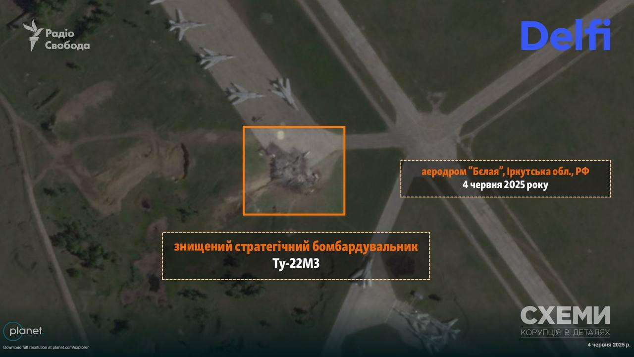 На російському військовому аеродромі "Біла" в Іркутську внаслідок української атаки безпілотниками 1 червня було пошкоджено сім літаків.