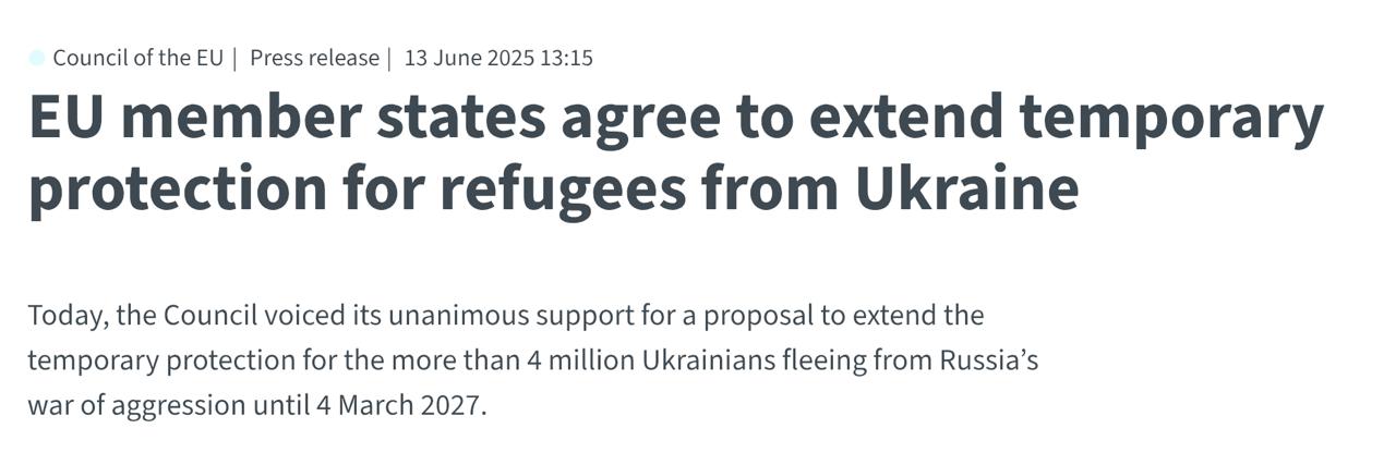 Починаючи з березня 2022 року ЄС надав безпеку та притулок понад 4 млн біженців з України на основі Директиви про тимчасовий захист. Нещодавно тимчасовий захист мав діяти до 4 березня 2026 року, проте тепер його продовжать до 4 березня 2027 року.