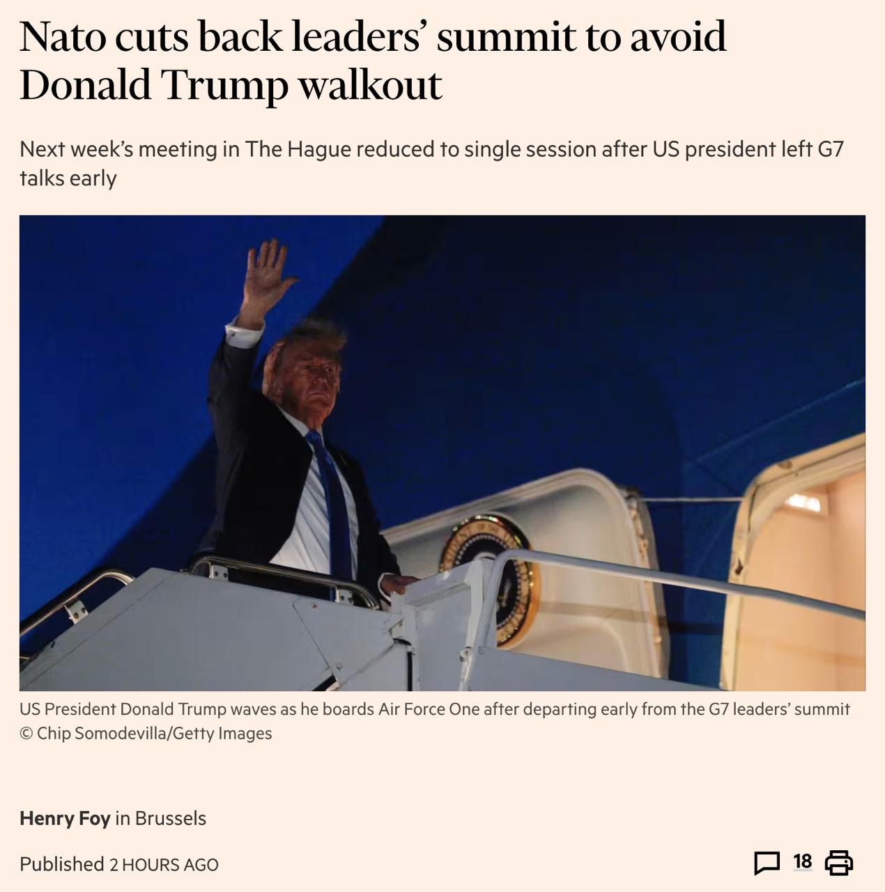 Через Трамп саміт НАТО наступного тижня скоротили до однієї робочої сесії тривалістю дві з половиною години, щоб президент США знову не виїхав достроково. Світові лідери зустрінуться у Гаазі в рамках саміту Альянсу у середу, а Зеленський візьме участь у вечері у вівторок увечері.