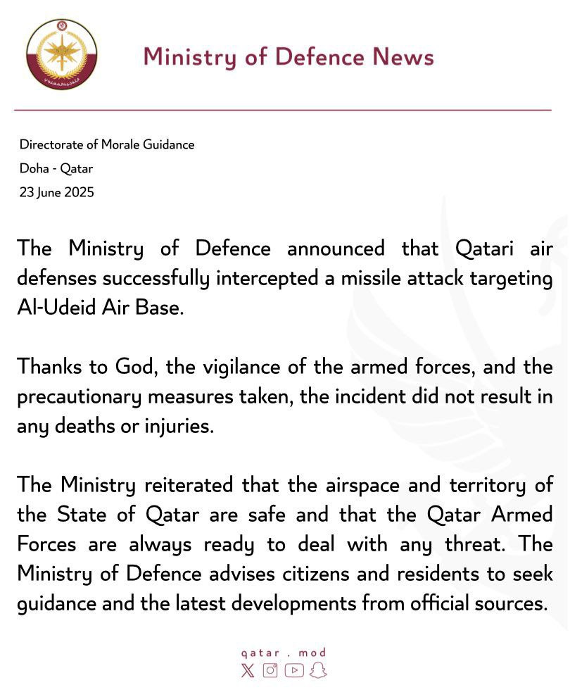 Аль-Ансарі також зазначив, що катарські сили ППО відбили атаку і успішно перехопили іранські ракети.