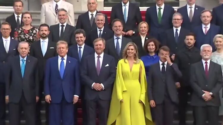 Саме між королем Нідерландів та президентом Туреччини Ердоганом на відео можна помітити і Трампа, який у самому центрі композиції, тоді як Зеленський стоїть у другому ряді.