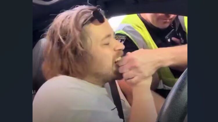 Заявляється, що авто чоловіка зупинили через те, що він проїхав на заборонний сигнал світлофора, але він почав поводитися агресивно щодо поліцейських саме після того, як йому повідомили, що він перебуває в розшуку.
