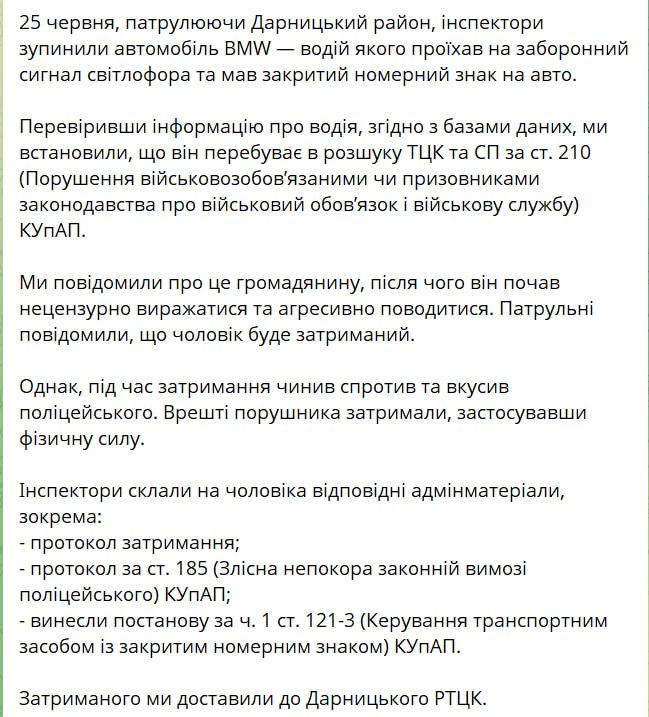 Пізніше патрульна поліція Києва повідомила, що чоловіка, який вкусив поліцейського, відправили до ТЦК.