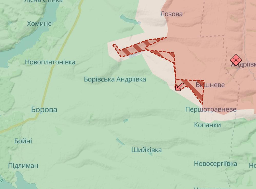 Також зафіксовано просування росіян приблизно на чотири кілометри у напрямку до Борової Харківської області з північного сходу. До міста залишилося понад вісім кілометрів.
