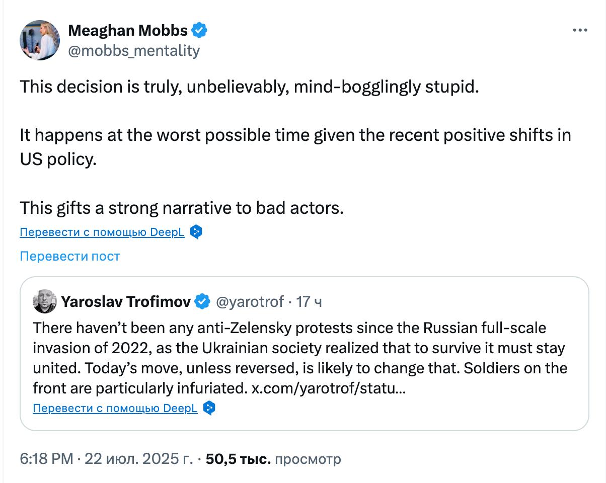 "Це рішення воістину, неймовірно, дивовижно безглуздо. Воно відбувається в невідповідний час, враховуючи недавні позитивні зрушення в політиці США. Це дає сильний привід для поганих акторів", - написала Моббс.