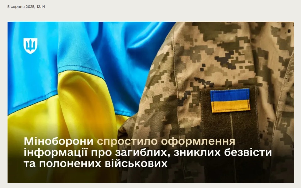 Міністерство оборони України у рамках удосконалення системи захисту прав військовослужбовців та їхніх сімей спростило документальне оформлення випадків смерті та загибелі, захоплення в полон, зникнення безвісти військових під час бойових дій.