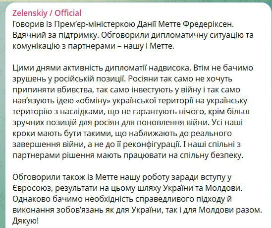 Про це Зеленський написав у своєму телеграм-каналі за підсумками розмови з прем'єр-міністром Данії Метте Фредеріксен.