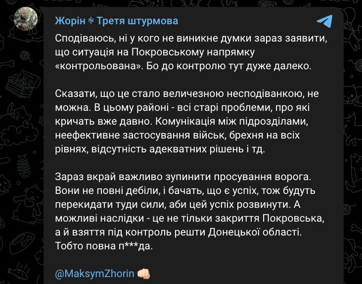 "Вони (росіяни - Ред. ) не повні ідіоти і бачать, що є успіх, тому будуть перекидати туди сили, щоб цей успіх розвинути. Можливі наслідки - це не тільки блокування Покровська, а й встановлення контролю над рештою Донецької області. Тобто повна п@@да", - додав Жорін.