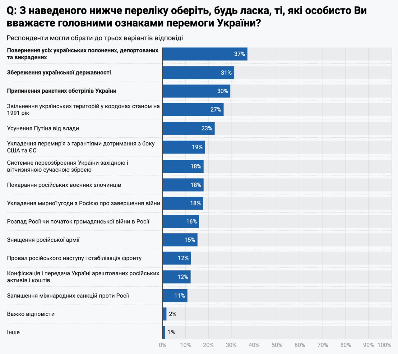 При цьому багато хто вважає, що перемогою буде повернення до кордонів 1991 року - 27% опитаних (можна було вибрати кілька пунктів). 30% вважають, що перемогою буде збереження державності.